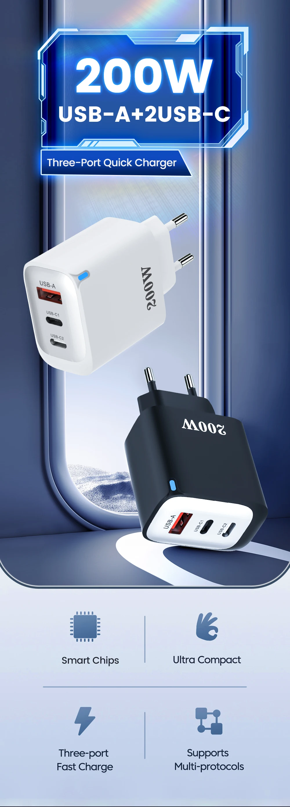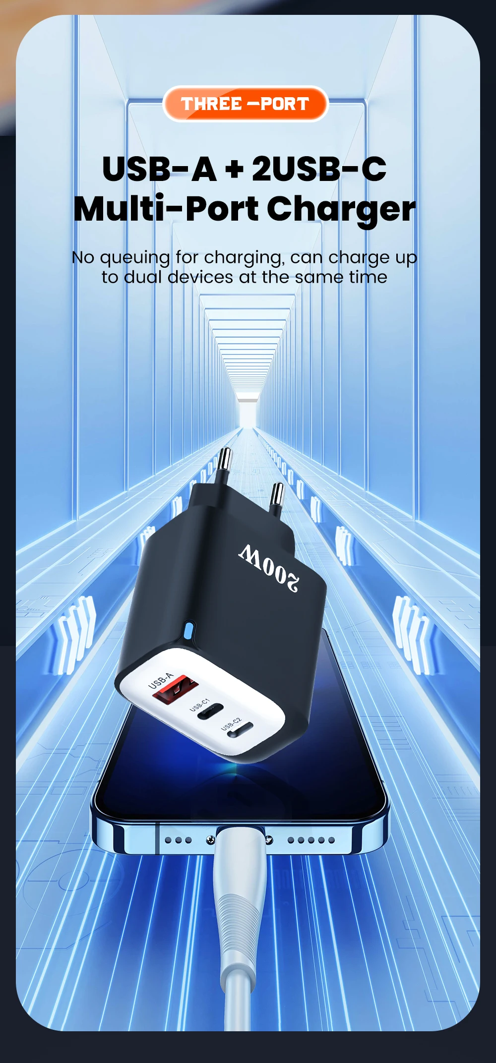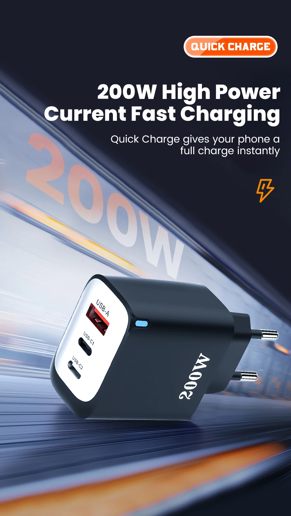 Experience Lightning Fast Charging with the Total PD200W USB Super Fast Charge 3-Port Charger - Perfect for iPhone, Xiaomi, and Samsung!