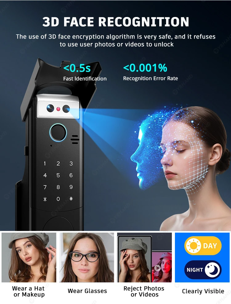 Unlock seamlessly via advanced 3D Face Recognition, Fingerprint, RFID Card, Password, Tuya App, or physical keys—flexibility for every user.