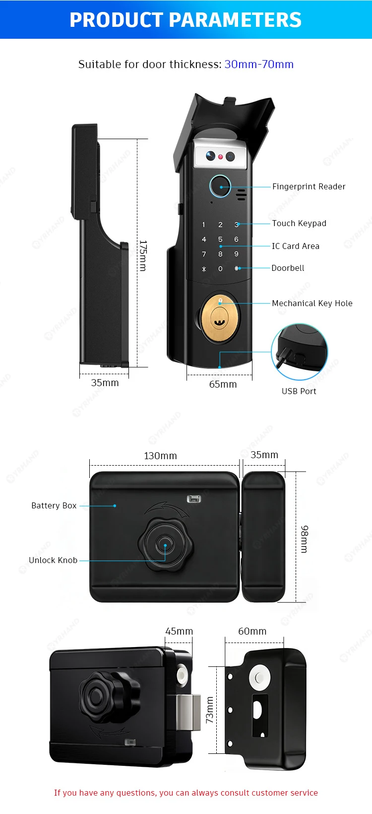 Suitable door thickness: 30-70mm(Wooden door, Steel door, Iron door, other metal doors)
